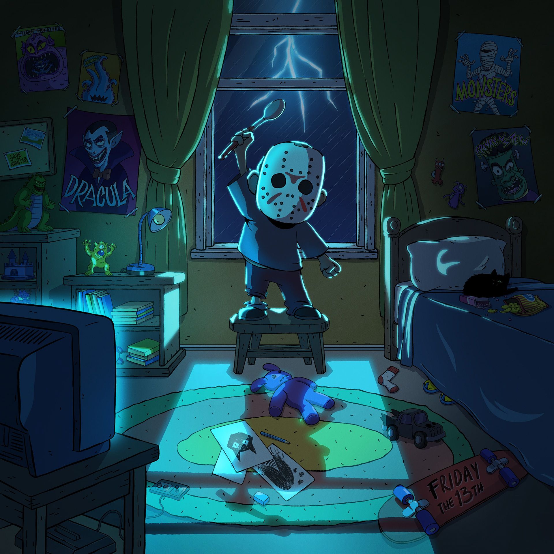 The process behind these illustrations was quite simple, as I wanted to place the characters in their own childhood bedrooms, surrounded by their toys and distractions. As is common in my work, I used certain lighting details to make the scenes more dramatic and visually appealing.